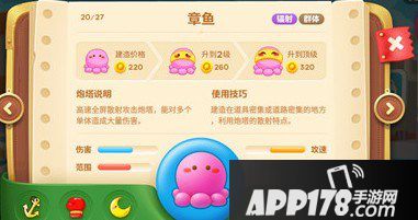 可爱的八爪鱼是一款群体攻击炮塔。它高速的全屏散射攻击,不仅可以攻击怪物,还可以同时清理场上道具。它非常适合作为开场炮塔,清理场上道具,积攒大量金币,冒险模式中获得金萝卜的不二选择!比赛模式中的,还可以获得必小胜5%的攻击力加成哦!