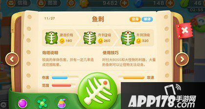 鱼刺是一款具有较高伤害的单体攻击炮塔,它有一定几率会造成范围眩晕,减速攻击两不误。在比赛模式中,利用鱼刺,搭配必小胜,轻轻松松迎战第30波怪物。鱼刺搭配月亮,可是糖果赛、赏金赛中的高分组合之一哦~