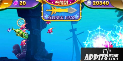 只要玩家击杀彩金鱼和BOSS鱼以外的其他鱼类,就可以对充能剑进行充能,同时积累保底奖金,在整个屏幕的正上方可以看到自己充能剑的充能程度,在充能剑能量满后,可以点击进行释放,瞬间秒杀除BOSS鱼外的全屏鱼类!