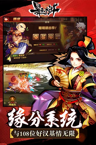 《暴走水浒》是一款颠覆乱“逗”新水浒策略手游,内有高颜值妹纸性转反串108位水浒好汉,530关无厘头剧情关卡轮番上阵来打造史上最呆萌逗趣的RPG策略卡牌手游。游戏首创追打系统,不占回合虐爆敌军,是好汉该出手时就出手。更有好汉缘分系统,谁与谁基情四射一览无余,随缘上阵还能获得基情光环加持战力!