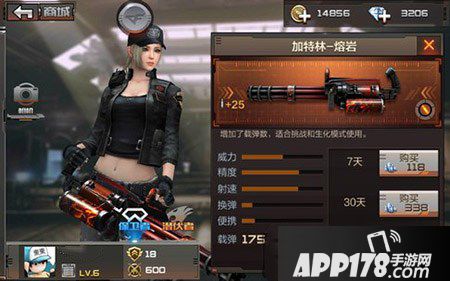 加特林熔岩是加特林机枪的升级版,机枪武器子弹在原有的150发子弹增加了25发子弹,武器射速和精准度也得到了很好提升,可以在商城用138钻石购买。相信会有不少玩家去购买的,这个武器打挑战可是非常好用的,子弹多射速快,打群体怪物就比较没那么吃力了。