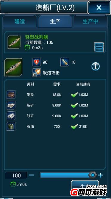 举个简单的例子,如果你想组一个轻型战列舰编队去突袭敌人。那么,我们在造船厂查得资料显示轻型战列舰需要的钢铁较多,那么,我们就可以把主要建造对象放在铁矿场这一块,然后再根据实际情况合理地将其他矿产分配好,这样就能确保万无一失地建立起轻型战列舰编队。