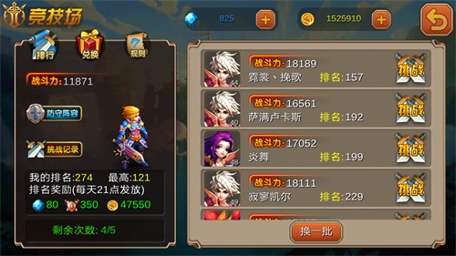 竞 技场实力为尊,65手游《超神联盟》中玩家要在竞技场生存,一切就看拳头。在初入竞技场时,玩家会根据当前战力获得一个排名,当然这排名不是固定的,玩家 可以挑战排名比你前的其他玩家,打赢就能抢占他的排名,每次系统会随机刷新出6名玩家,挑战者可以随意挑战,如果感觉这批玩家比较厉害,还可以换一批,让 系统重新刷新。在挑战前玩家可以查看该玩家的战力和英雄搭配,然后对比自己的英雄和战力,这样知己知彼才能百战不殆,确保自己能挑战成功!