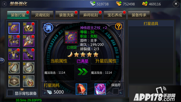 在打星过程中会有一定几率失败,在0-4星这个期间失败是没有任何惩罚的,大家可以随意打星,但4星后在打星失败时将出现掉星的惩罚(是时候来拼一波人品了)。随着装备可携带等级的提升,装备的星级上限也将随之提高。