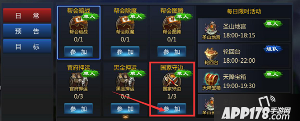 首先大家点击主界面的【活动日历】进入综合面板,之后点击【国家守边】即可开始为国家守卫边疆的任务!