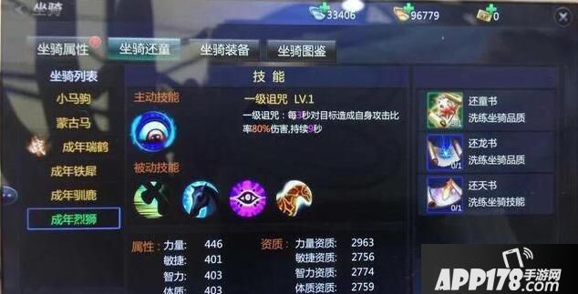 作为一款骑马作战游戏,坐骑玩法一直是成吉思汗的特色。手游版中有包括马、鹿、鹤、狮子、老虎、犀牛、羚羊等等数百种坐骑。坐骑的不是移动工具,同时是角色最佳的战斗伙伴,有完善的成长体系。如:坐骑的技能,有先天技能和后天技能之分。