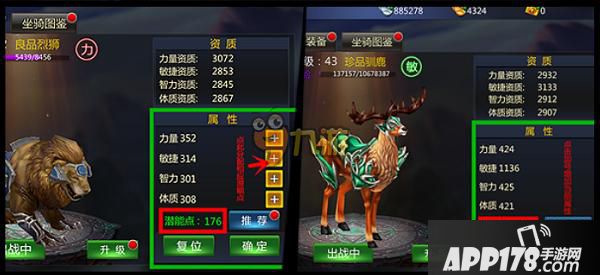 每个坐骑,在与你共同战斗的过程中,会有自己完整的经验加成和成长线。还可以通过坐骑还童,将坐骑还原到1级,并改变坐骑技能和资质属性。每个坐骑都会带有技能,莫小看这些技能,有可能是你KO对手的关键。你的智力、体质、敏捷等,都会随着坐骑技能的改变而改变。