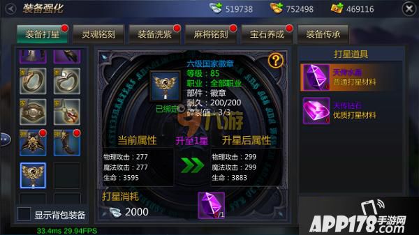 随着大家角色等级的提升,会在左下角的隐藏图标中,解锁装备强化系统,大家即可在装备强化中进行装备打星操作。在打星过程中会有一定几率失败,在0-4星这个期间失败是没有任何惩罚的,大家可以随意打星,但4星后在打星失败时将出现掉星的惩罚(是时候来拼一波人品了)。随着装备可携带等级的提升,装备的星级上限也将随之提高。