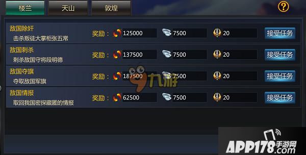 国家系统玩法详解出国任务介绍:出国任务,是30级以上的玩家组队侵略敌国的趣味玩法,含夺旗、行刺、锄奸、情报。其开启时间更加灵活,收益也非常可观。
