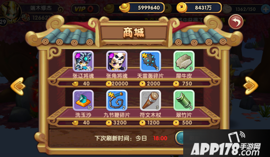 商店界面可以点击左右两侧的按钮切换商店类型,下图为游戏内普通商店,每日18:00刷新商店中道具,普通商店中可以购买到资源道具、武将碎片、装备碎片、装备成品等。