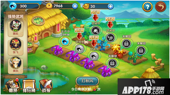 强势武将:强势武将可以在打秋风时获得攻击和血量加成,武将进化次数和星级越高,获得的加成越高,强势武将每日0点刷新。