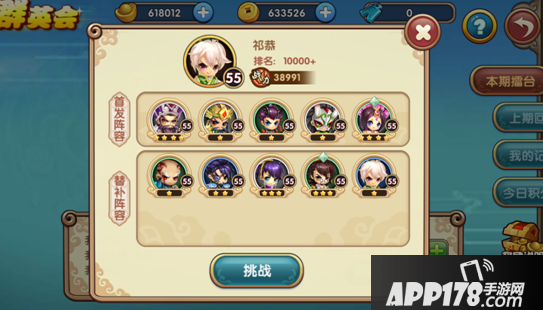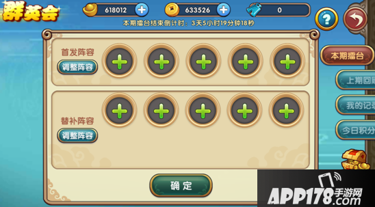 报名以后会提示到本期擂台的开赛倒数时间,并且需要进行2组阵容的排布,第一就是首发阵容,当然替补阵容是在首发阵容英雄阵亡后上场替换的。