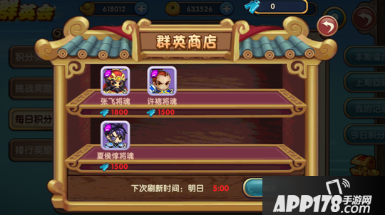积分可以在群英商店中兑换稀有武将将魂碎片。后续还会更新更多新武将。商店的刷新时间均在每日凌晨5:00。根据每期累积的积分,可以领取对应的积分奖励。