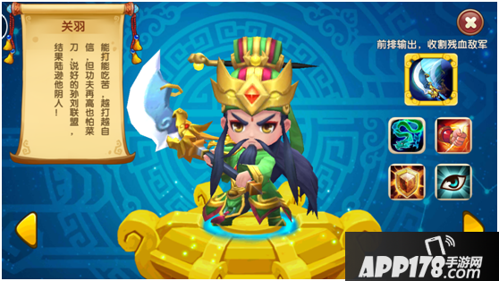 关羽属于前排输出型武将,无双附带溅射伤害,大招针对残血敌人造成额外伤害。同时初期被动技能增加武将攻击和生命,增加了武将的输出和生存能力,蓝色时可以增加我方前中排攻击力。从关羽的技能特性来看,较为适合作为输出型副T,加大整队输出。