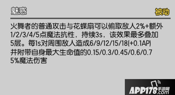 解析:火舞是一个近战ap,有翔龙之火被动的存在,配合日炎能对周围单位造成不可忽视的魔法伤害;出冰杖和大面具不仅能提升一定的血量,还能增加花舞扇技能伤害;由于大招回旋踢的存在,火舞会冲入人群中作战,所以需要狂徒、兰顿、护甲鞋这样的防御装备提高生存能力。