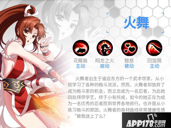 火舞出生于遥远东方的一个武术世家,从小就学习了各种的格斗流派,然而火舞却放弃了成为格斗家的机会,而立志成为一名忍者,为此她四处拜师学艺,终于小有所成,如今的她正在为成为一名优秀的忍者而到世界各地修行。也许是从小练习格斗的原因,火舞的身材曲线非常健康性感~