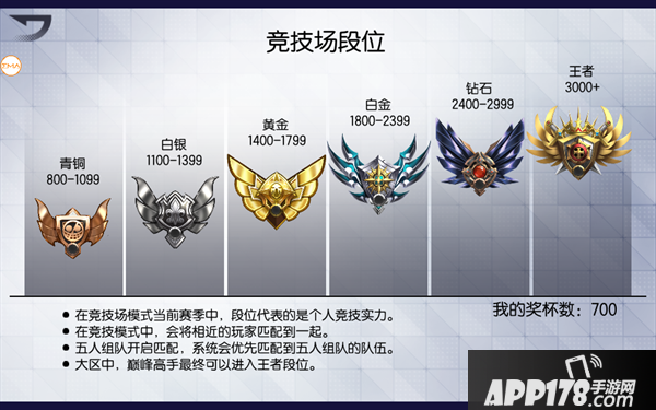 在自我资料左下方可以看到自己的奖杯分数和段位,点击段位标志后可显示全部段位和奖杯。