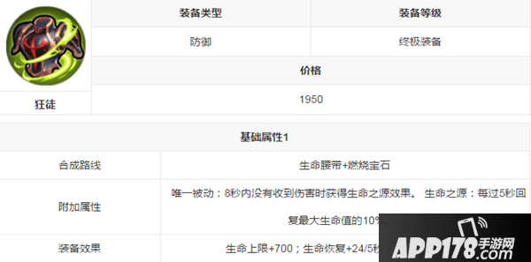 狂徒这件装备的属性针对英雄的生命值属性。700的生命上限提高能瞬间让英雄看上去肉的不行。最亮眼的就是这个生命之泉的被动,每过五秒回复最大生命值的10%。对于一个近战英雄来说,一场团战下来,多多少少都会损失不少血量,然而回城又麻烦,回复技能的CD时间又太长。这个时候狂徒的被动就很好用了。脱离战斗后,生命之泉能让自己在很短时间内将血量回上去。避免了回城的烦恼。