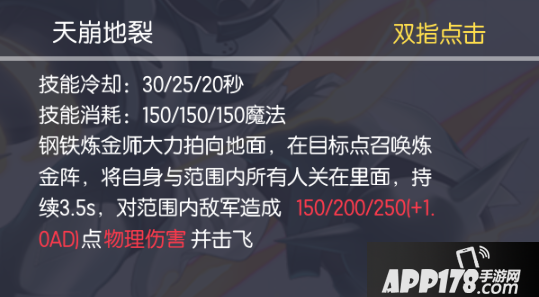 炼金的技能说明他能在1级团就可以很好给予足够的留人控制,他可以冲撞到对面敌人击退,然后平A眩晕目标,如果队伍里有战场主宰(钩子),那么这个眩晕的敌人就会被拉到队友身边一起殴打,然后保持冲撞,敌人就无法逃脱。