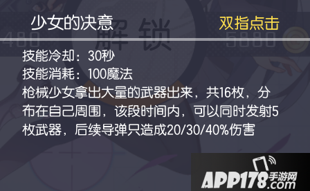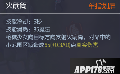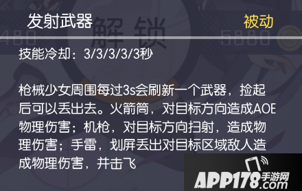 枪械的技能说明她是一个具备混合伤害的高输出英雄。主动技能有4个:①火箭筒(AD加成真实伤害);②轻机枪(AD加成物理伤害);③手榴弹(AD加成魔法伤害);④大招,自身附近出现大量火箭筒。被动技能有4个:①3秒获得一个随机枪械武器;②捡起武器可以回复蓝量;③每次捡起新武器首次释放可以获得加速;④失去一部分攻速但获得更高的额外的攻击力加成。