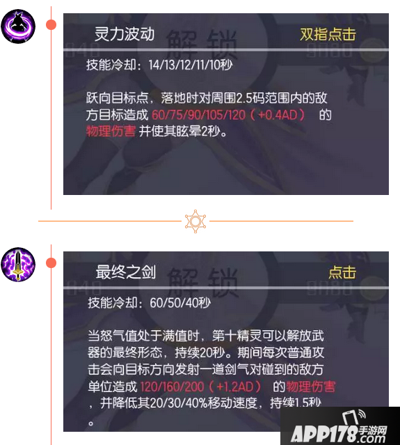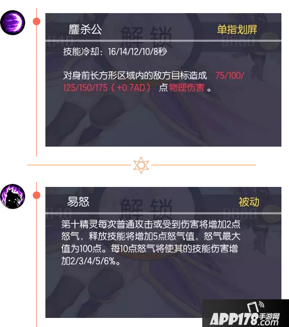 第十精灵的技能说明她是可以利用怒气来打出高额技能输出的英雄,1技能(主动)中距离范围伤害,因为前期技能CD过长的原因主要用于清兵线;2技能(被动)攻击和收到伤害以及释放技能都会增加怒气,怒气用于提高技能伤害;3技能(主动)跳跃目标范围,造成伤害和眩晕,进可攻退可守的两用位移技能;4技能(主动)怒气值满时,可以开启大招,大招改变普攻为远程剑气,同时增加额外输出能力,配合被动怒气提高百分比,相当于每次打出暴击的输出,非常恐怖。