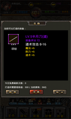 装备兑换实际为装备打造,每日0点后系统自动生成玩家当前级别的装备,消耗熔炼值可兑换该装备。兑换装备还可以通过刷新重置,系统每天0点之后生成2次免费刷新次数,消耗完之后可每次消耗20元宝进行刷新。兑换紫色装备消耗500点熔炼值;兑换橙色装备消耗1500点熔炼值。