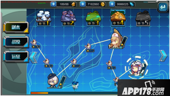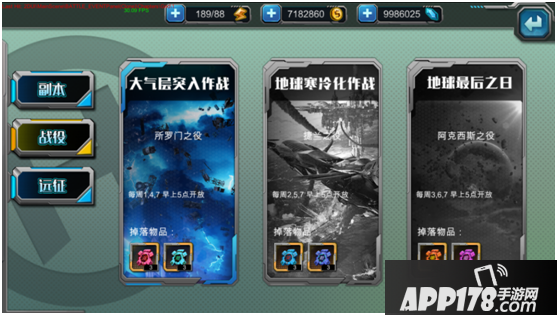出征下分:副本、战役、远征三种战斗方式。