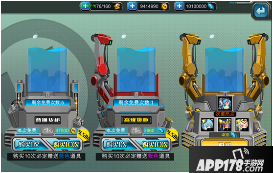 高级货柜:在高级货柜玩家可以使用钻石购买,有几率获得三星机娘、道具