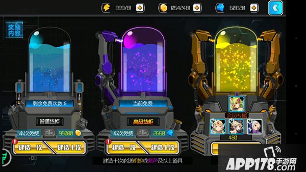 高级货柜:在高级货柜玩家可以使用钻石购买,有几率获得三星机娘、道具