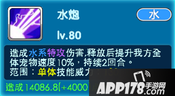 水炮:照成水系特攻伤害,释放后提升我方全体宠物速度10%,持续2回合。