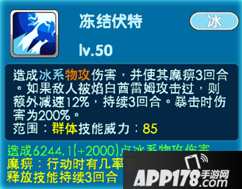 冻结伏特:造成冰系特攻伤害,并使其麻痹3回合。如果敌人被焰白酋雷姆攻击过,则而外速减速12%,持续3回合。暴击时伤害为200%。