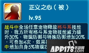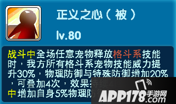 当亲密度达到三十级的时候-正义之心:战斗中全场任意宠物释放格斗系技能时,我方所有格斗系宠物技能威力提升30%,物理防御与特殊防御增加20%,可叠加4次,效果持续4回合。属于被动技能。