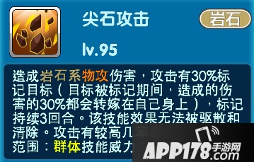 当亲密度达到十级的时候-尖石攻击:造成岩石系物攻伤害,攻击有30%标记目标(目标被标记期间,造成的伤害的30%都会转嫁在自己身上),标记持续3回合。该技能效果无法被驱散和清除。攻击有较高几率暴击。属于群体技能,技能威力50。