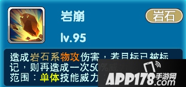 初始技能-岩崩:造成岩石系物攻伤害,若目标已被标记,则再造成一次50%威力的伤害。属于单体技能,技能威力75。