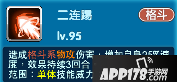 当亲密度达到二十级的时候-二连踢:造成格斗系物攻伤害,增加自身25%速度,效果持续3回合。属于单体技能,技能威力75。