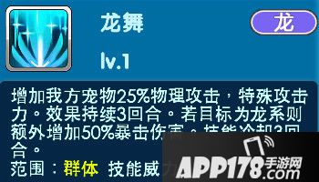 当亲密度达到十级时解锁-龙舞:增加我方宠物25%物理攻击,特殊攻击力。效果持续3回合。若目标为龙系则额外增加50%暴击伤害。技能冷却3回合。范围:群体 技能威力:0