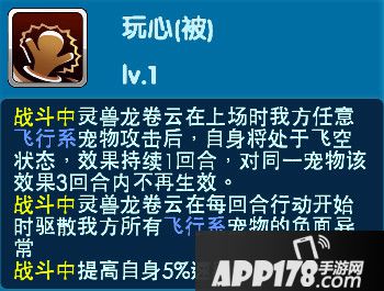 灵兽龙卷云的被动技能[玩心]战斗中灵兽龙卷云在上场时我方任意飞行系宠物攻击后,自身将处于飞空状态,效果持续1回合,对同一宠物该效果3回合内不再生效。战斗中灵兽龙卷云在每回合行动开始时驱散我方所有飞行系宠物的负面异常。飞空以及驱散负面状态可谓是锦上添花,还有不选择灵兽龙卷云的理由吗?