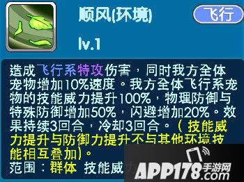技能[顺风]造成飞行系特攻伤害,同时我方全体宠物增加10%速度。我方全体飞行系宠物的技能威力提升100%,物理防御与特殊防御增加50%,闪避增加20%。效果持续3回合。先手释放,造成破盾以及加buff一举两得,增加的buff可谓相当全面:技能威力、防御力、速度、闪避。