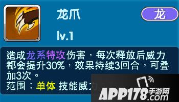 初始技能-龙爪:造成龙系特攻伤害,每次释放后威力都会提升30%,效果持续3回合,可叠加3次。范围:单体 技能威力:75