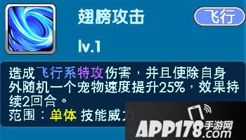 当亲密度达到二十级时解锁-翅膀攻击:造成飞行系特攻伤害,并且使除自身外随机一个宠物速度提升25%,效果持续2回合。范围:单体 技能威力:75