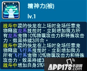 当亲密度达到三十级时解锁-精神力(被动技能):战斗中渡的快龙在上场时全场任意宠物释放龙系技能时,立刻增加我方所有龙系宠物10%物理攻击力和特殊攻击力,效果持续3回合。战斗中渡的快龙在上场时全场任意宠物释放飞行系技能时,立刻增加我方所有飞行系宠物10%物理攻击力和特殊攻击力,效果持续3回合。战斗中增加自身5%特殊攻击力。