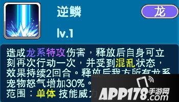 当亲密度达到五级时解锁-逆鳞:造成龙系特攻伤害,释放后自身可立刻再次行动一次,并受到混乱状态,效果持续2回合。释放后我方所有龙系宠物怒气增加30%。范围:单体 技能威力:125