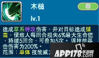 当亲密度达到十级时解锁-木槌:造成草系特攻伤害,并对目标造成猛毒,使敌人每回合损失6%最大生命值,持续5回合,可叠加5次。该技能暴击伤害为200%。范围:单体 技能威力:75