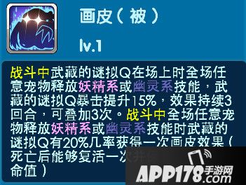 当亲密度达到三十级时解锁-画皮(被动技能):战斗中武藏的谜拟Q在场上时全场任意宠物释放妖精系或幽灵系技能,武藏的谜拟Q暴击提升15%,效果持续3回合,可叠加3次。战斗中全场任意宠物释放妖精系或幽灵系技能时武藏的谜拟Q有20%几率获得一次画皮效果(死亡后能够复活一次并保留20%最大生命值)。