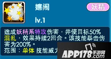 当亲密度达到二十级时解锁-嬉闹:造成妖精系特攻伤害,并使目标50%混乱,效果持续2回合。该技能暴击伤害为200%。范围:单体 技能威力:75