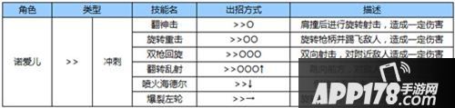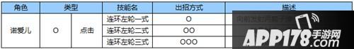 《苍翼之刃》中,根据起手操作的不同,英雄技能可分为点击、上划、横划、下划、冲刺、特殊六大类型,具体技能效果因英雄而异。以下为“双枪软妹”诺爱儿的出招表(操作说明:O为点击屏幕,>为方向键,↑为上划,↓为下划,→为横划):