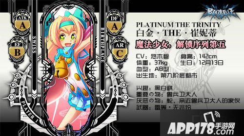 白金·THE·崔妮蒂『PLATINUM THE TRINITY』是《苍翼之刃》中的一名萌系魔法萝莉,有着萌萌外表和袖珍身高,战斗时挥舞着仙女棒施展魔法少女式的攻击。在游戏的剧情设定中,白金体内拥有着双重人格——少女露娜跟少男赛那,武器是看似玩具实则威力爆棚的事象兵器『雷轰·无兆铃』,其实这把神器寄存着当年六英雄之一的崔尼蒂灵魂,从而导致了白金幼小的躯体中寄宿着完全不同的三重人格。