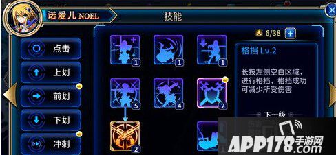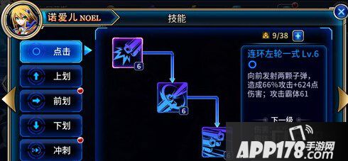 游戏中的技能分为点击、上划、前划、下划、冲刺以及特殊,在这之上选择的话,优先升级点击的,因为这个是最基础的,之后的根据英雄的特点,自己常用的连招进行升级,比如诺爱尔,在升级点击之后就可以选择升级前划,这个是使用加特林机枪攻击,也是用的比较多的。