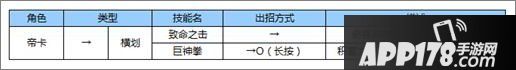 苍翼之刃中,根据起手操作的不同,英雄技能可分为点击、上划、横划、下划、冲刺、特殊六大类型,具体技能效果因英雄而异。以下为“赤鬼”帝卡的出招表(操作说明:O为点击屏幕,>为方向键,↑为上划,↓为下划,→为横划):