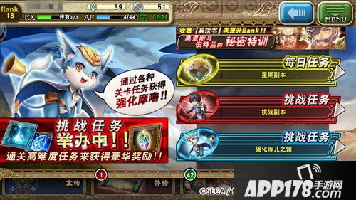活动任务大致有四种,星期副本、挑战副本、强化库儿之馆以及限时副本。星期副本主要用来刷各种觉醒材料以及技能材料,挑战副本游戏初期可以不考虑,强化库儿之馆是专门用来刷“强化库儿”卡牌的(库儿馆的钥匙可以通过打外传掉落),而限时副本是游戏不定期开放的活动,活动“莫里斯的秘密特训”,可以让大家在无AP的情况下刷经验。
